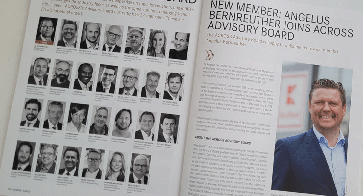 The ACROSS Advisory Board was established in mid-2016. From day one, the board’s stated goal has been to offer its expertise in topic formulation. Over the years, the board has not only grown, but it has also become more interdisciplinary, just like the retail real estate world itself. In addition to shopping center managers, the board includes architects, retail experts, financial experts, PropTech professionals, consultants, and outlet managers. The mix of expertise from the various areas that our industry has to offer makes the ACROSS board unique. That is not only due to the fact that the mixed-use asset class is on the rise, but also because we all know that collaboration and thinking outside of the box are essential to our business. The ACROSS Advisory Board is currently comprised of 27 members. That gives us the opportunity to closely monitor current trends and changes within the industry and to be able to classify them. Learn more about the ACROSS Advisory Board.