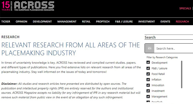 In times of uncertainty, knowledge is key. ACROSS constantly reviews and compiles current studies, papers, and different types of publications under its Research section. There you can find extensive lists of relevant research from all areas of the placemaking industry. Many features, such as Research Categories, Research Regions, and Year of Publication are helping in specifying the search for research papers.