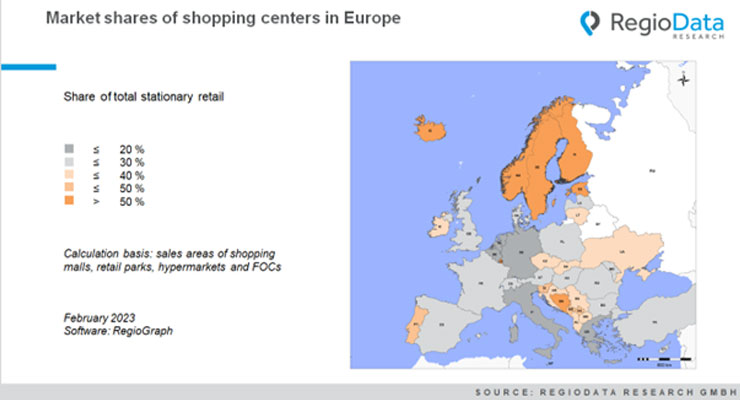 Iceland has by far the highest shopping center share in Europe at 63% of the total retail trade. Estonia takes second place with just under 55%, and Norway third with 53%. Luxembourg and Sweden are also in the top 5 with just over 50%, mainly due to the northern weather conditions and the often smaller and less retail-oriented city centers. Accordingly, people are fleeing to shopping centers. In Northern Europe, shopping centers have unusually large sales areas, so sizes of over 60,000 sq m are not uncommon. While shopping centers are booming in some countries, the trend is stagnant in large parts of Central Europe. Italy and Germany, in particular, have a low proportion of shopping centers in terms of floor space. With a national sales area of just under 125 million sq m, shopping centers in Germany account for only about 15.6% of this. In Italy, the shopping center share is 17%. In both countries, inner-city shopping streets dominate the existing sales areas.